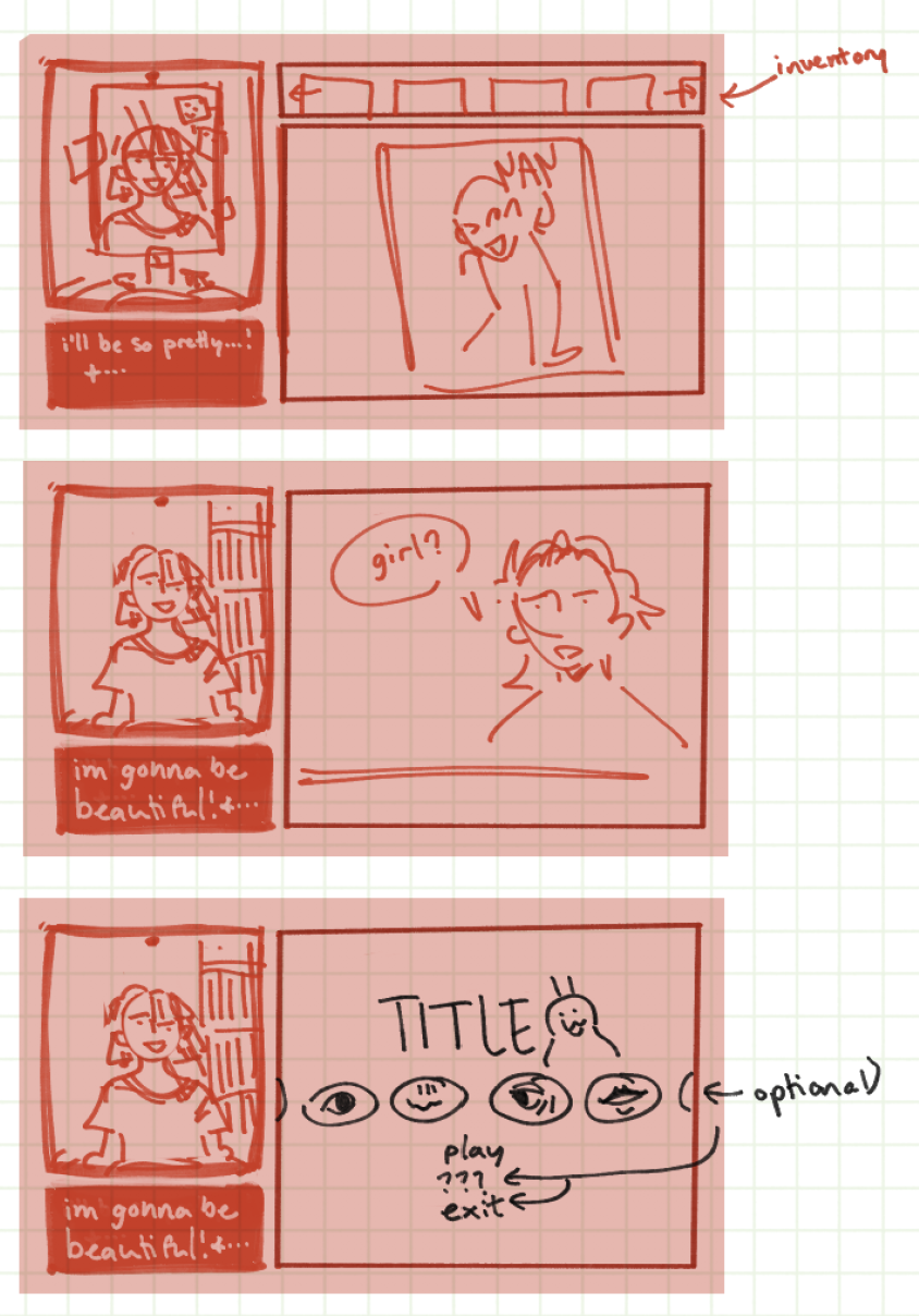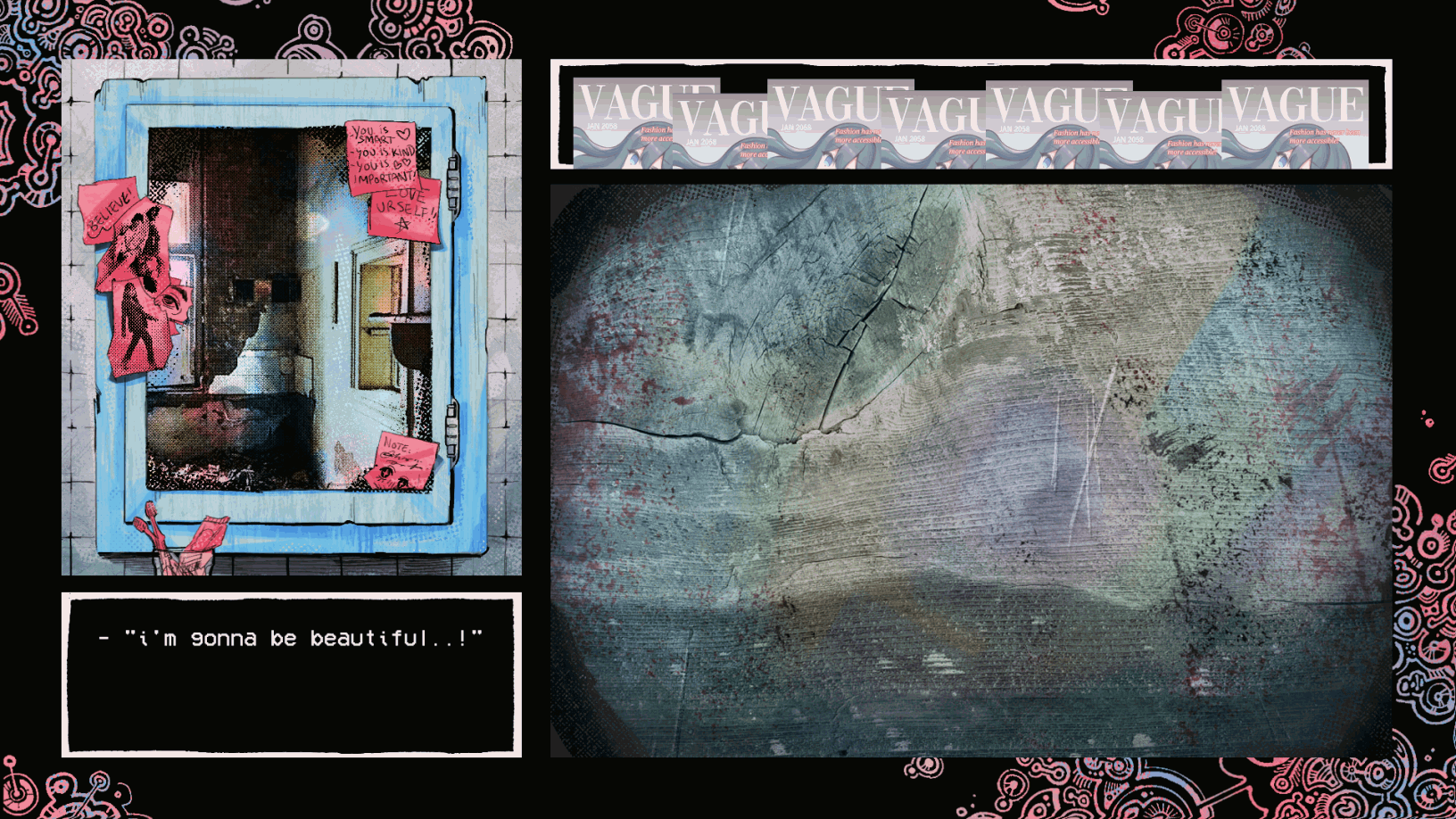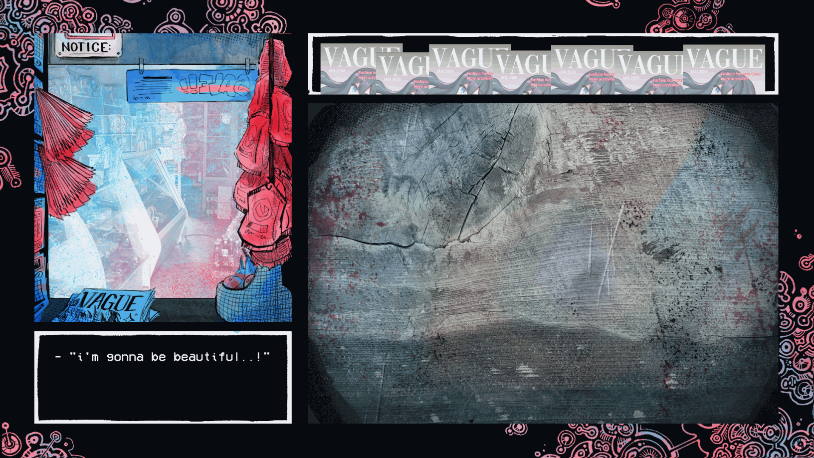 I mainly focused on crating the UI for this game. The main idea would be to split it into various, smaller screens allowing the player to see the protagonist's appearance and a closeup of the magazines simultaneously. Initially, the cutscenes and title screen would also follow this format, but this was changed later into production.