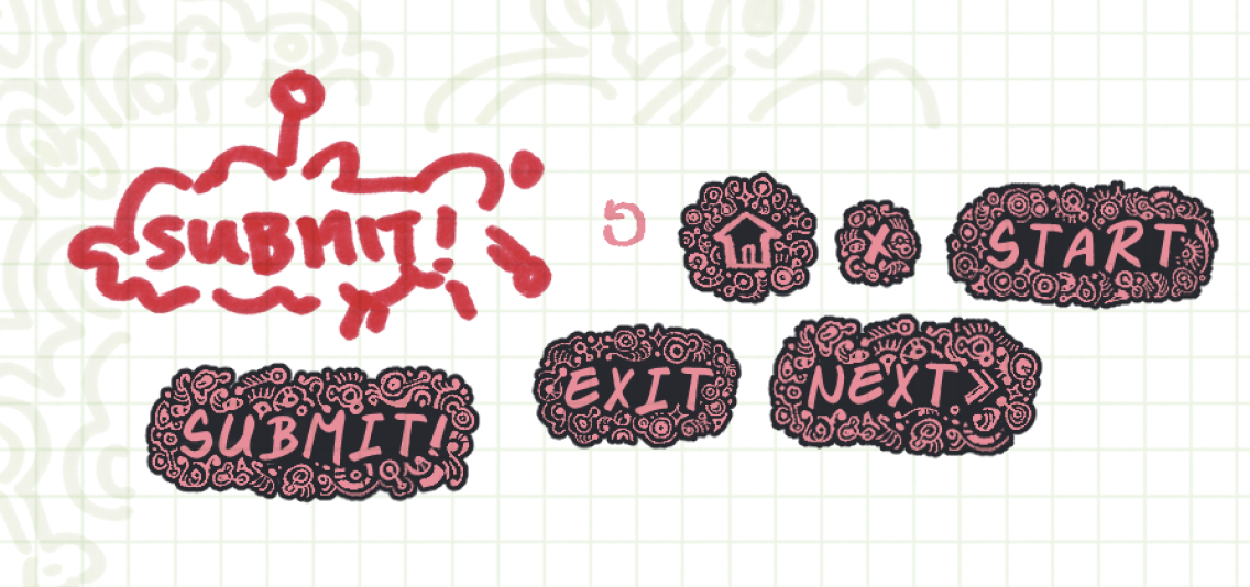 To give the buttons some visual interest, I added an elaborate pattern around each one, to match with the area around the frame. Each of these is unique: I only copied half of a single pattern. The pattern I used was based on how mold grows in ring patterns, tieing in with the existing themes of organic decay and growth seen in the gameplay.