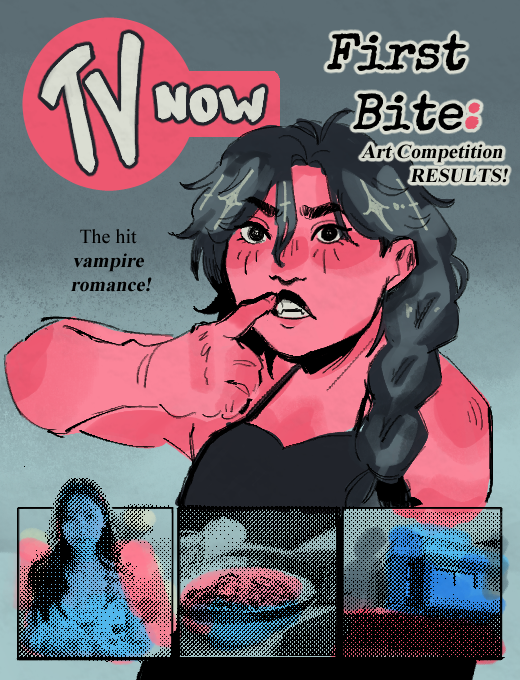 I also had barely enough time to make a magazine cover and spread for the game. The goal was to include two large sparkly eyes and an exaggerated pointy chin as the features, so I decided to make an article about a tropey vampire tv-drama. I wrote the text portion to include several reference to vampire media; as well as small hints drawing attention to the features of interest.