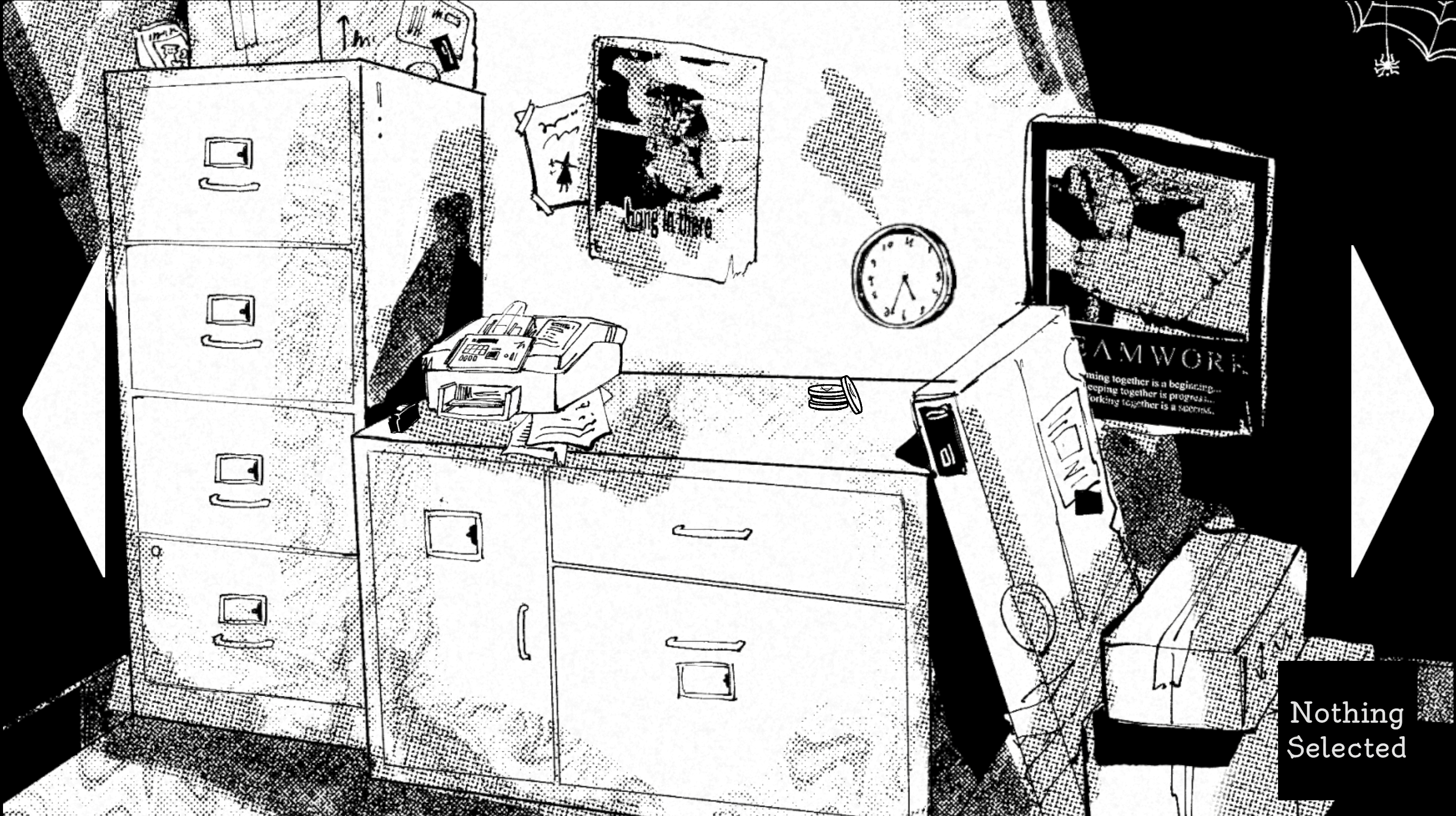 To keep the scope of Night Shift realistic for the jam, we quickly decided that it'd be set in a single office. I took inspiration from classic point-and-click games to present this as various static 2d screens, the idea being that the protagonist is spinning around a single point too see all of them.