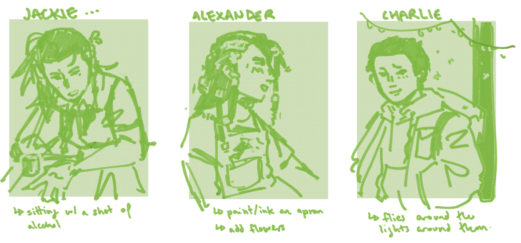 I recieved the short character briefs seen in-game from our writer, and wanted to make sure each of their portraits not only included visual hints for their puzzle items, but also showed a snippet of their lives prior to the game, and highlight who they were before becoming ghosts.