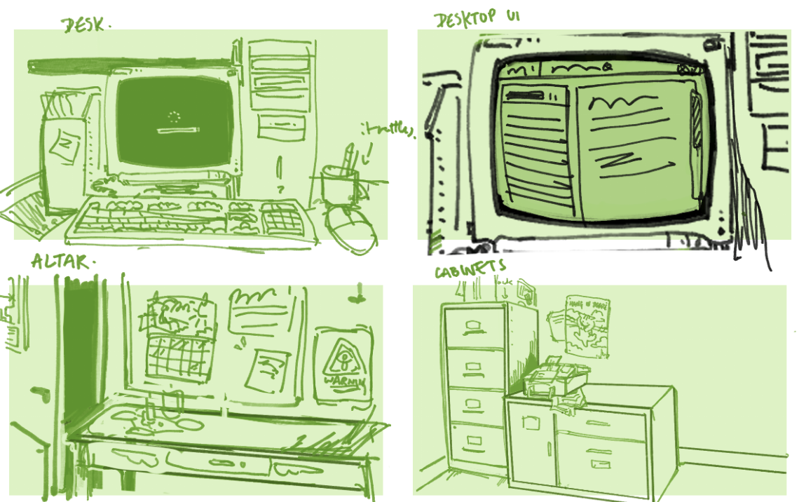 For the props and desktop UI, I took a lot of inspiration from 90s tech. That said, don't think Night Shift takes place in a set time period. The only elements that aren't hand-drawn are a couple posters that I edited to fit better into the environment, as well as add a couple extra details. Unfortunately, we didn't have enough time to implement a more cohesive UI.